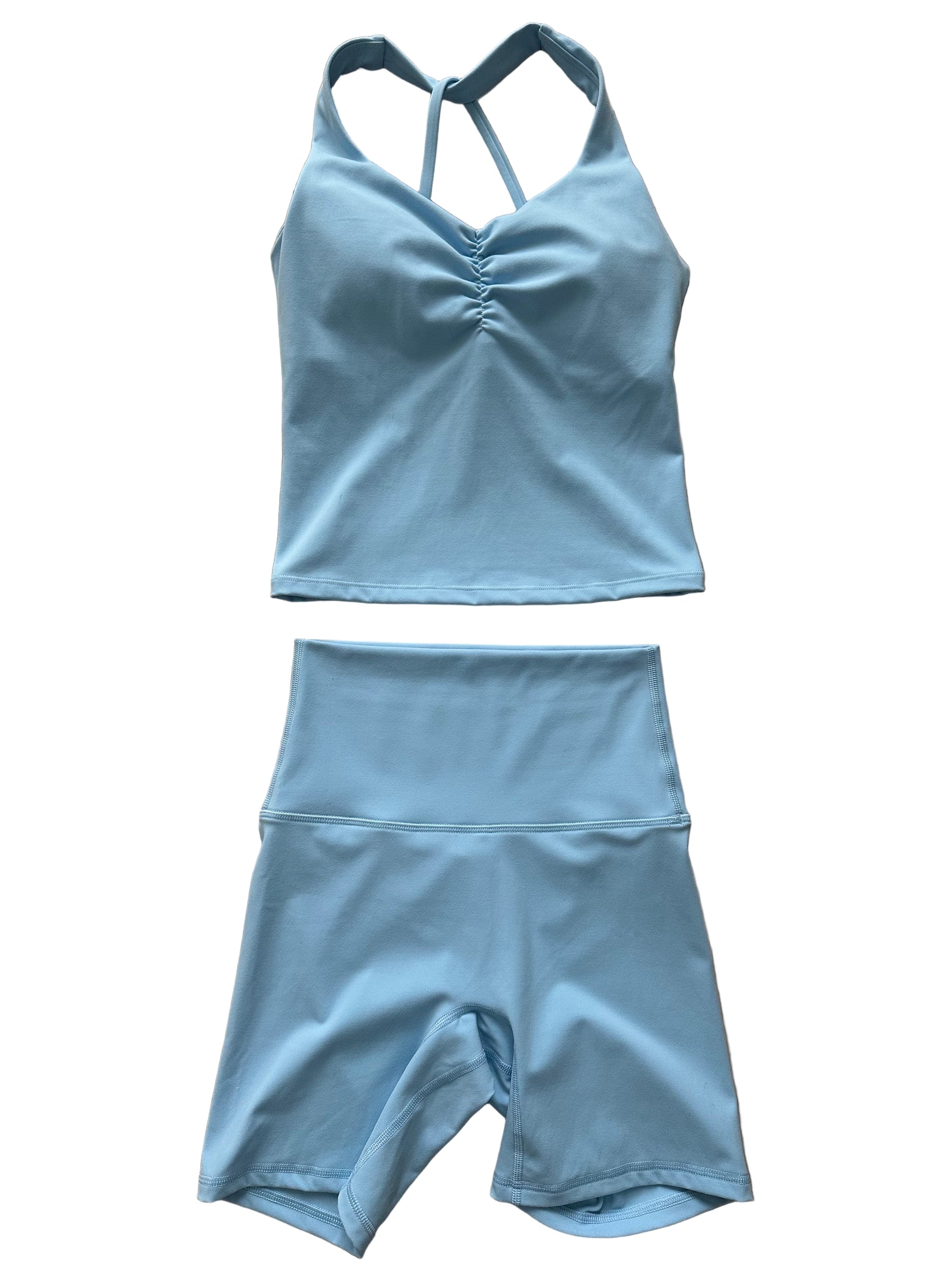 Cindy Shorts in a soft light blue shade offer a chic, tailored fit with a cinched waistband that enhances your silhouette. Designed to perfectly complement the Cindy cinched top, they combine elegance and comfort for a polished, coordinated for a stylish look.